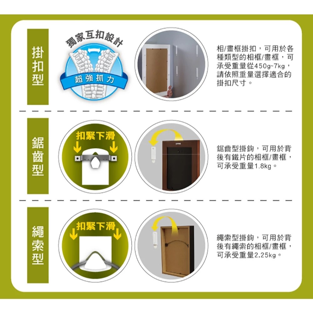 【フレームレス写真用】3Mシームレスフレームフックジグ... 菠蘿選画所 <p><span>菠蘿選畫所販售之3M掛畫產品,皆為官方正貨,請大家放心購買!<br /><br /></span></p> <p><span>◆ 產地:台灣(掛鉤);美國(膠條)<br /></span>◆ 內容物:1支鋸齒形相框掛 2片膠條 1片酒精片<br />◆ 重量:23.01g<br />◆ 國際條碼:051131767522<br /><br /></p> <p></p> <p><span>(1) 使用3M獨家專利無痕膠條,黏貼時粘著穩固,去除時不傷粘著表面,不留殘膠</span></p> <p><span>(2) 每一組可載重重量為 2.25kg</span></p> <p><span>(3) 適用30.6*40.6(約0.8kg)/ 42*59.4(約1.4kg)/ 50*70cm(約1.55kg) 無框畫做吊掛</span></p> <p><span>(4) 掛鉤可重複使用</span></p> <p><span>(5) 本商品屬耗材品,一經拆封使用,恕無法辦理退貨<br /><br /></span></p> <p></p> <p><span style="color:#f5a623;"><strong>商品特色:</strong></span><br />• 來去不留痕跡! 粘著穩固,可重複使用<br />• 掛鉤可重複使用,粘著力強又穩固,掛鉤可乘重量大</p> <p><span style="color:#f5a623;"><br /><strong>溫馨提醒:</strong></span><br />• 3M鋸齒型掛勾<span style="color:#ff2a2a;">不適用</span>以下畫作喔: 40*160cm/ 80*80cm/ 70*100cm。<br />大畫單幅重量約在4-5kg,