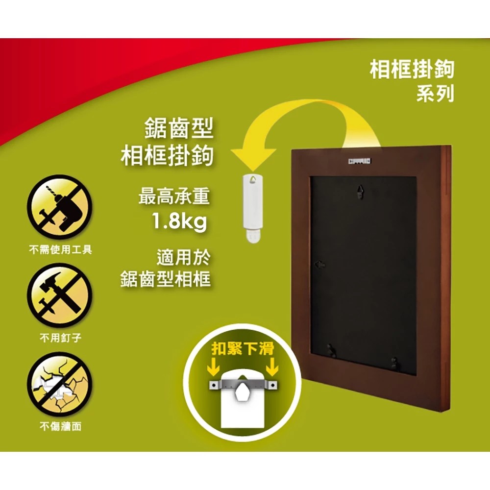 【フレームレス写真用】3Mシームレスフレームフックジグ... 菠蘿選画所 <p><span>菠蘿選畫所販售之3M掛畫產品,皆為官方正貨,請大家放心購買!<br /><br /></span></p> <p><span>◆ 產地:台灣(掛鉤);美國(膠條)<br /></span>◆ 內容物:1支鋸齒形相框掛 2片膠條 1片酒精片<br />◆ 重量:23.01g<br />◆ 國際條碼:051131767522<br /><br /></p> <p></p> <p><span>(1) 使用3M獨家專利無痕膠條,黏貼時粘著穩固,去除時不傷粘著表面,不留殘膠</span></p> <p><span>(2) 每一組可載重重量為 2.25kg</span></p> <p><span>(3) 適用30.6*40.6(約0.8kg)/ 42*59.4(約1.4kg)/ 50*70cm(約1.55kg) 無框畫做吊掛</span></p> <p><span>(4) 掛鉤可重複使用</span></p> <p><span>(5) 本商品屬耗材品,一經拆封使用,恕無法辦理退貨<br /><br /></span></p> <p></p> <p><span style="color:#f5a623;"><strong>商品特色:</strong></span><br />• 來去不留痕跡! 粘著穩固,可重複使用<br />• 掛鉤可重複使用,粘著力強又穩固,掛鉤可乘重量大</p> <p><span style="color:#f5a623;"><br /><strong>溫馨提醒:</strong></span><br />• 3M鋸齒型掛勾<span style="color:#ff2a2a;">不適用</span>以下畫作喔: 40*160cm/ 80*80cm/ 70*100cm。<br />大畫單幅重量約在4-5kg,