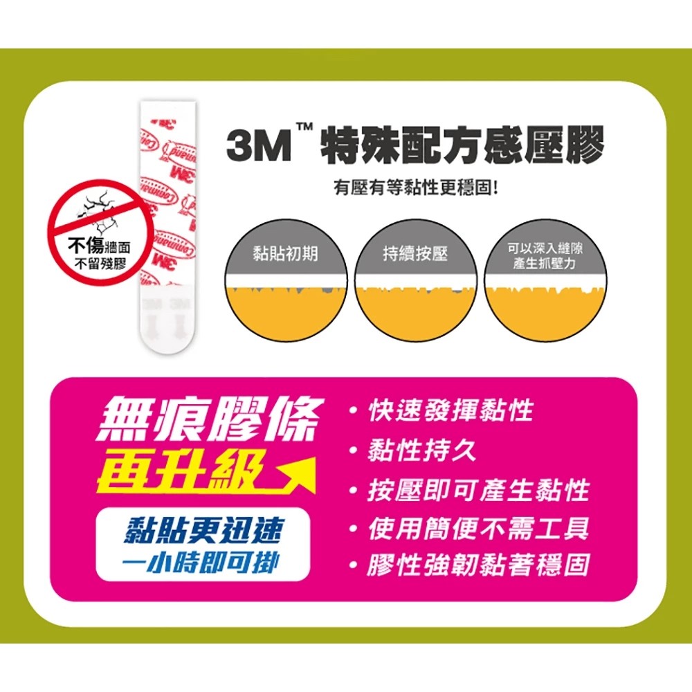 (1) 使用3M獨家專利無痕膠條,黏貼時粘著穩固,去除時不傷粘著表面,不留殘膠