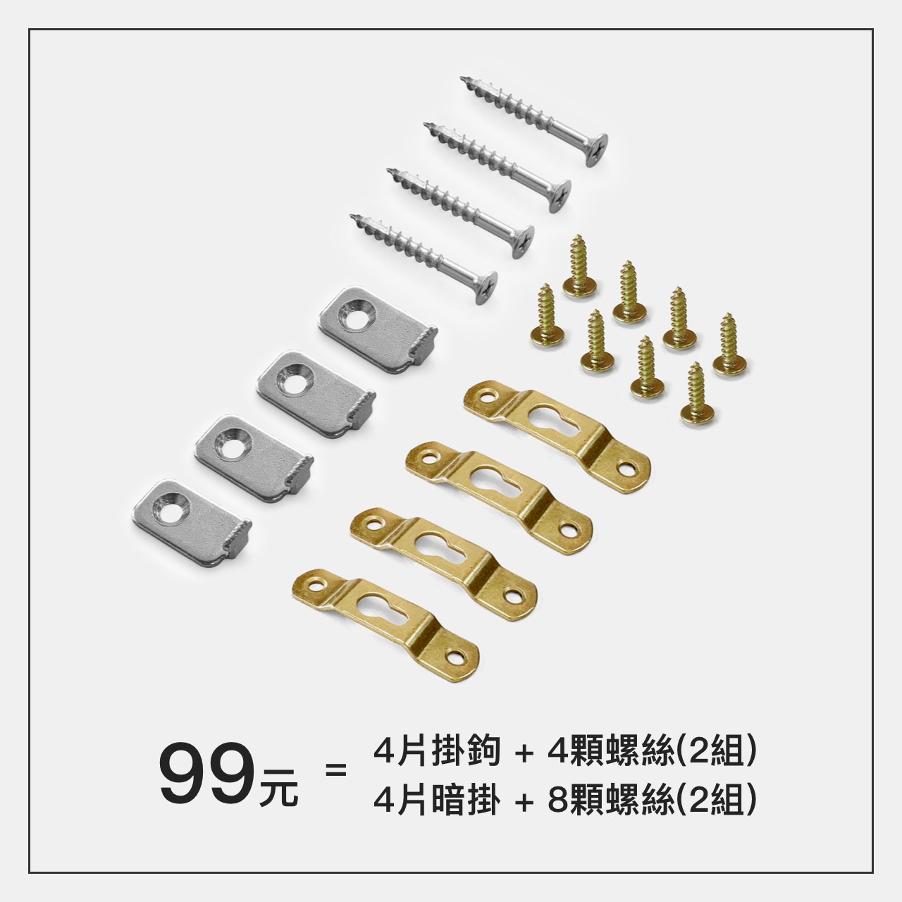 2組 =【4片隱形掛鉤+4顆螺絲】、【4片掛環+8顆螺絲】