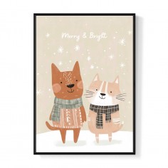 狐狸與貓咪圍著暖暖圍巾,漫步雪地間,